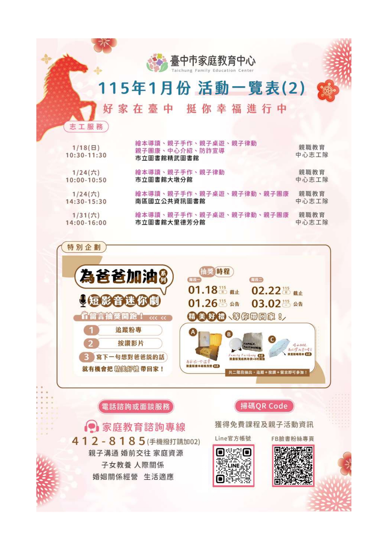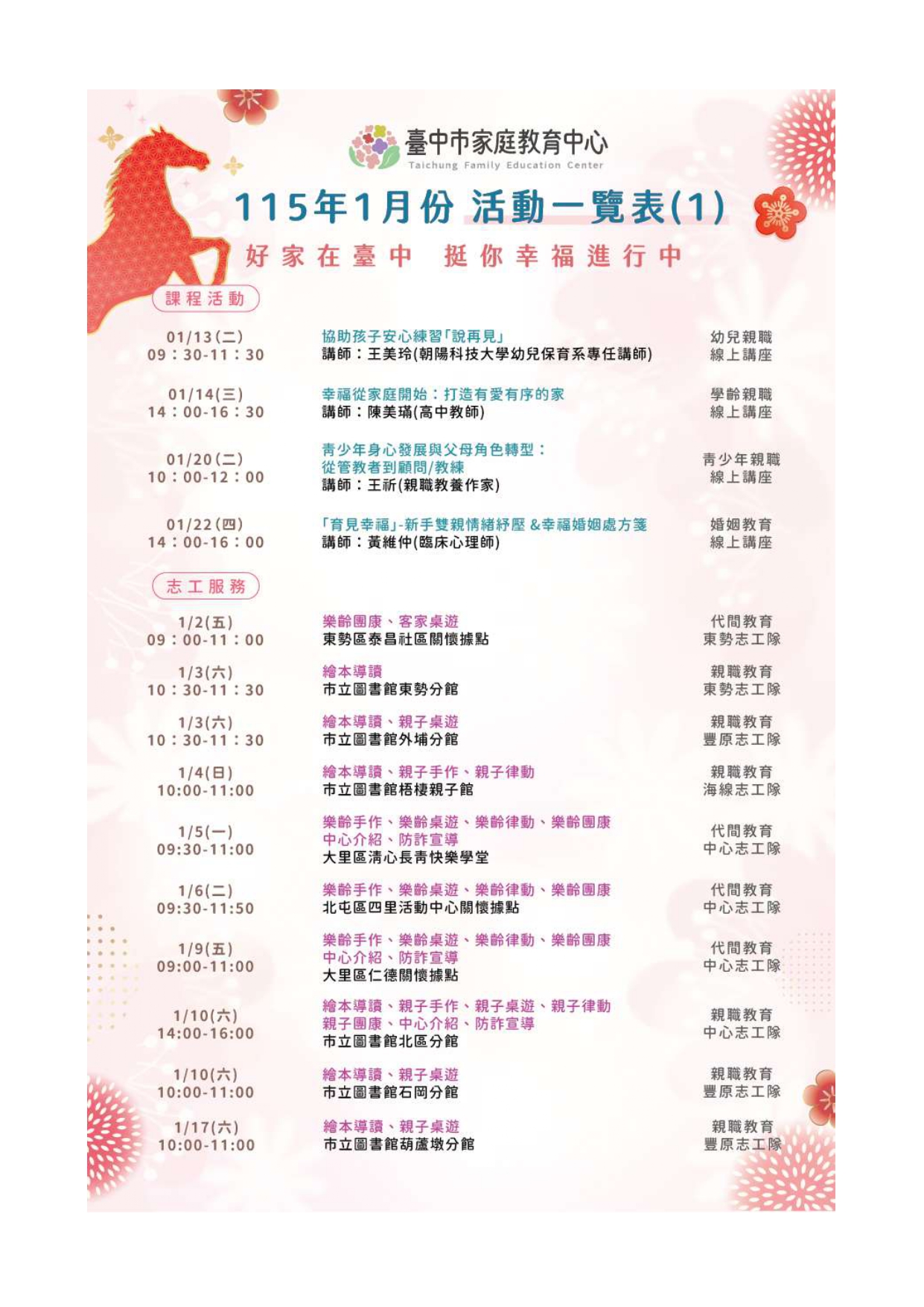【轉知】臺中市家庭教育中心【115年1月份活動一覽表】 搶先開箱